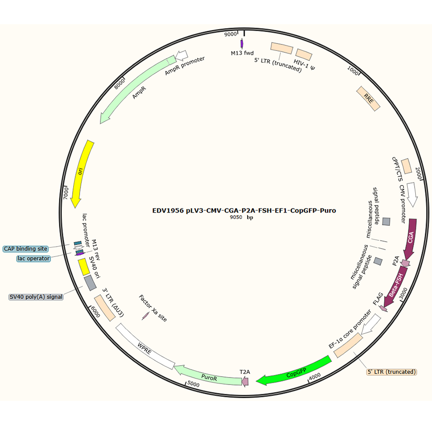 pLV3-CMV-CGA-P2A-FSH-EF1-CopGFP-Puro
