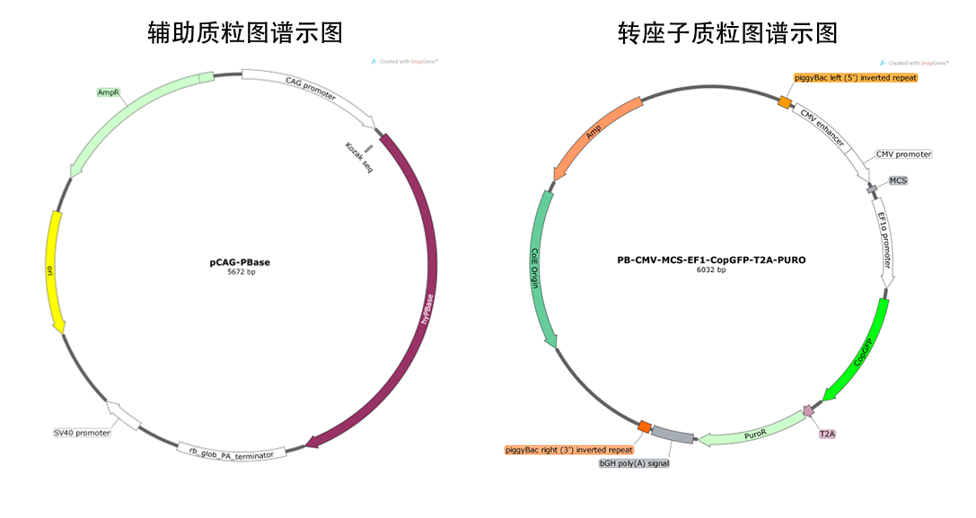 piggyBac转座子系统作为非病毒载体,与传统的病毒载体相比,PiggyBac具有以下优势:安全性高、操作方便(可直接用质粒转化细胞);载体容量大,可实现多基因的共表达;可顺利获得调节转座子质粒和辅助质粒的比例,提高外源基因的整合效率,并且可顺利获得反向PCR精确确定目的基因插入的位置;再次转座后实现转座子精确切离;宿主范围广,转座效率高,较少依赖宿主因子。